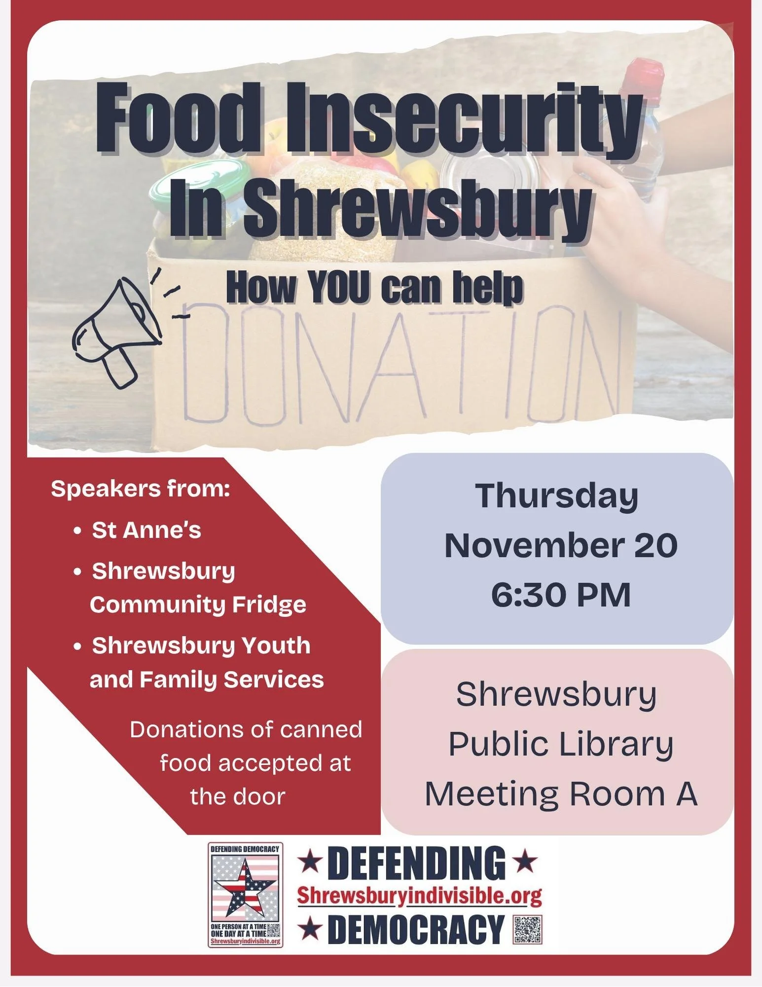 Shrewsbury Indivisible is a registered chapter of “Indivisible”. Indivisible chapters are decentralized networks of thousands of local groups across the US. Indivisible was formed in response to the 2016 election and started with the indivisible guide, a manual on how to resist authoritarianism using grassroots pressure. The movement is focused on defending democracy, the rule of law and progressive values. Shrewsbury Indivisible was formed in 2025 and is a group of concerned citizens standing up for democracy and peace and we invite you to join us. We are a non-violent, peaceful and volunteer powered group.
